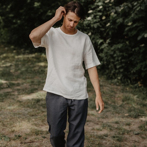 A white T-shirt with linen pants